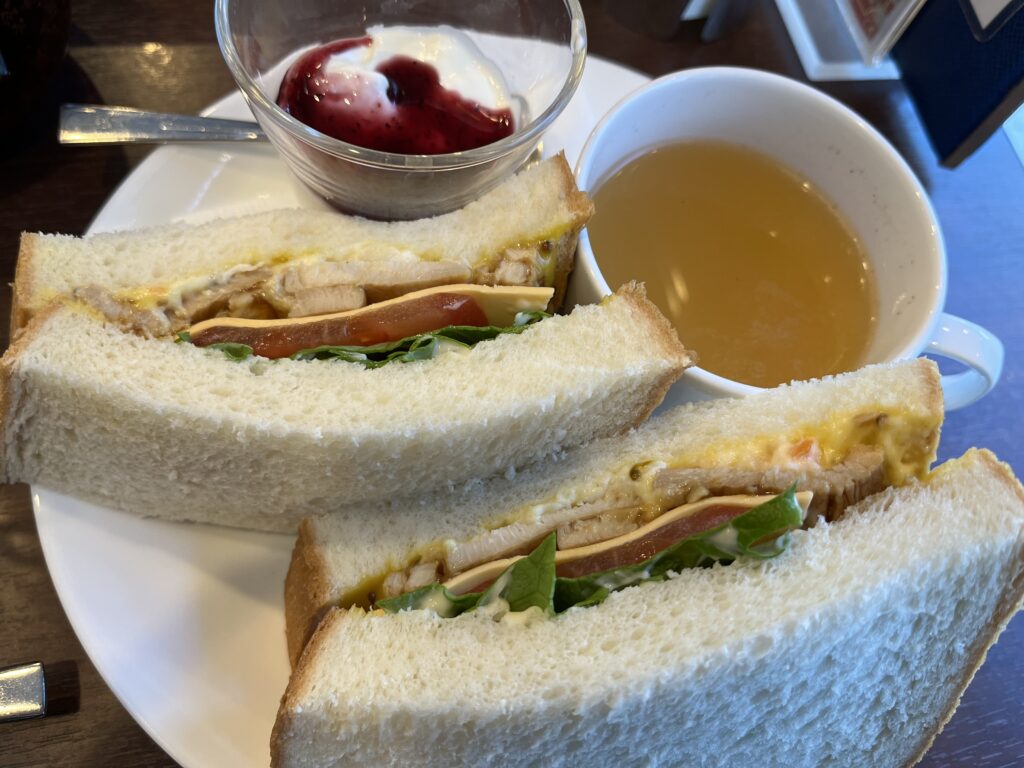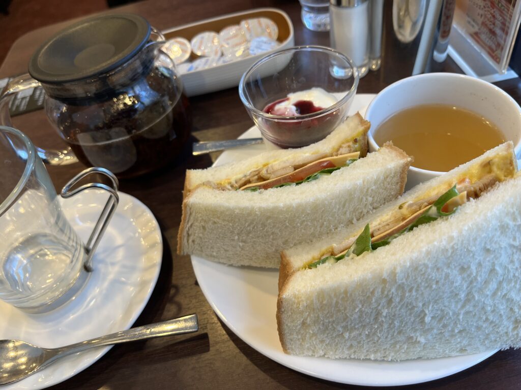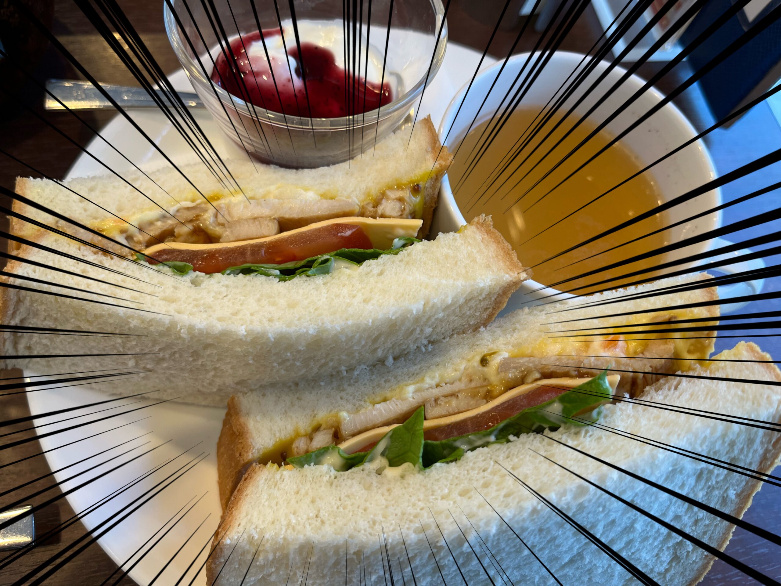 実は家で軽く朝食を済ませてきていた筆者であったが、それでも味は確かなので飽きずにサンドイッチを完食。コンソメスープで落ち着かせる。