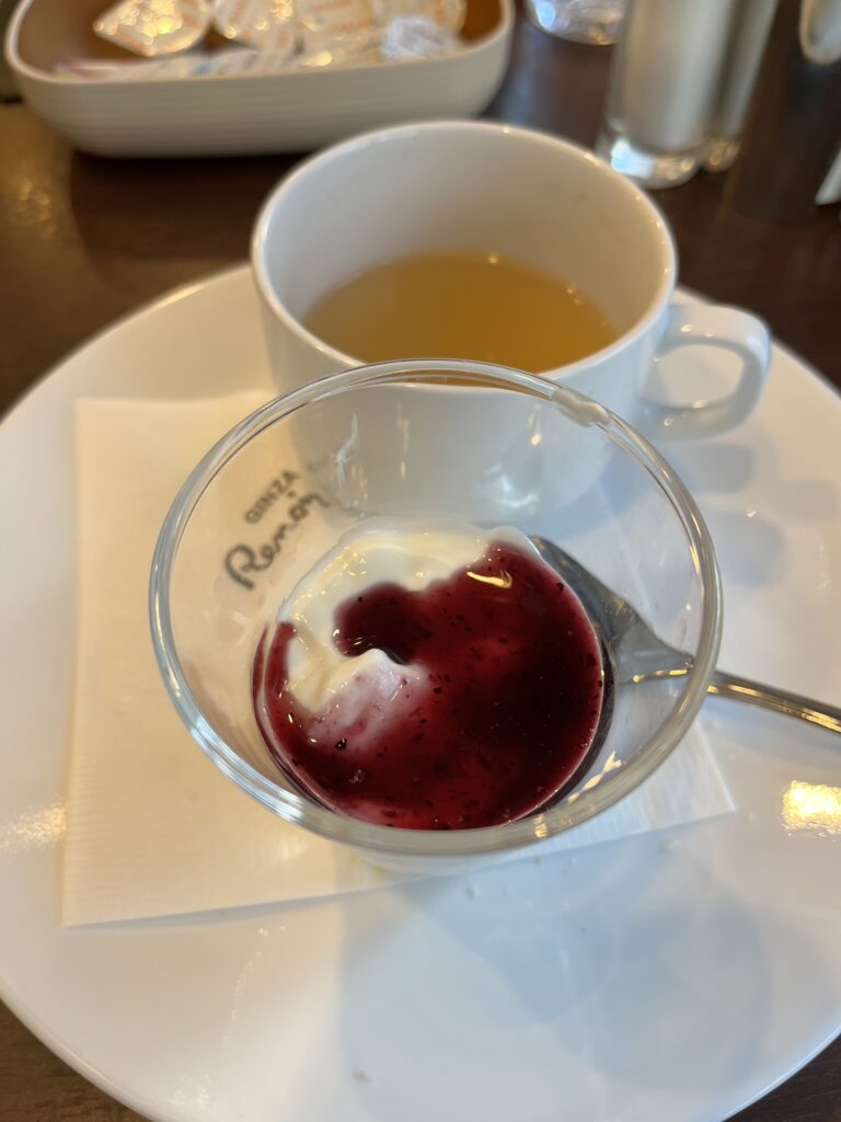 デザートの濃厚ヨーグルトにはブルーベリーソースがかかっており、名前に偽りなく濃いヨーグルトで満足度が高い。